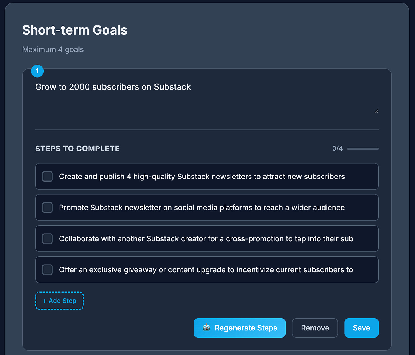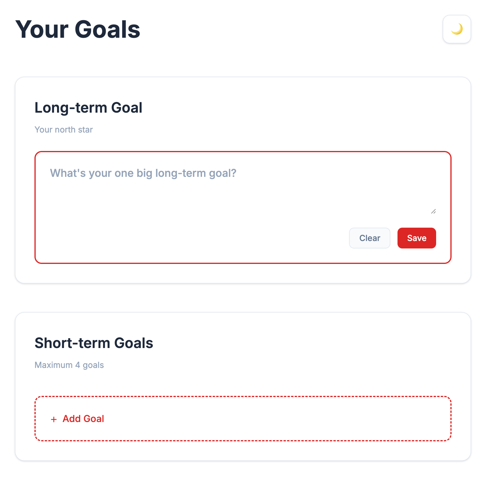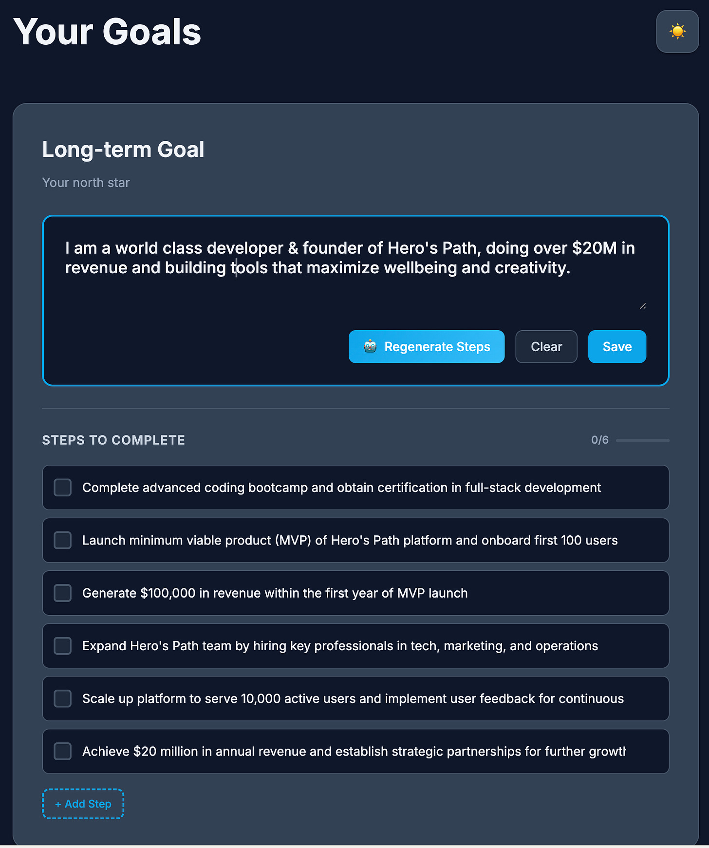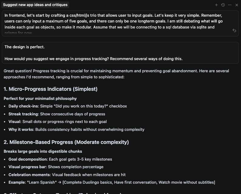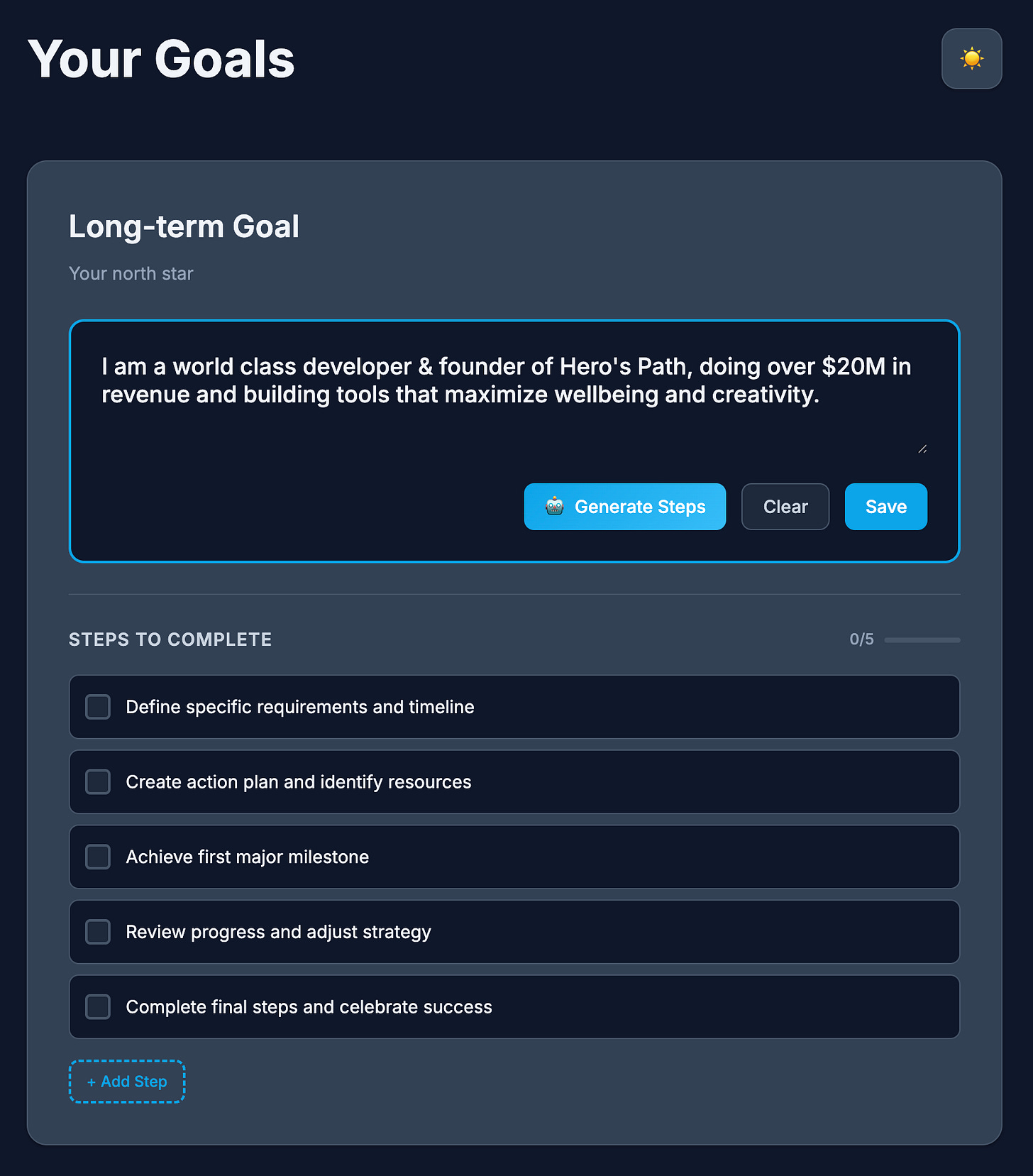 My vision here is to create a simple goals app that allows for the creation of 5 goals: 1 long-term and 4 short term, with AI functionality for generating and editing milestones.