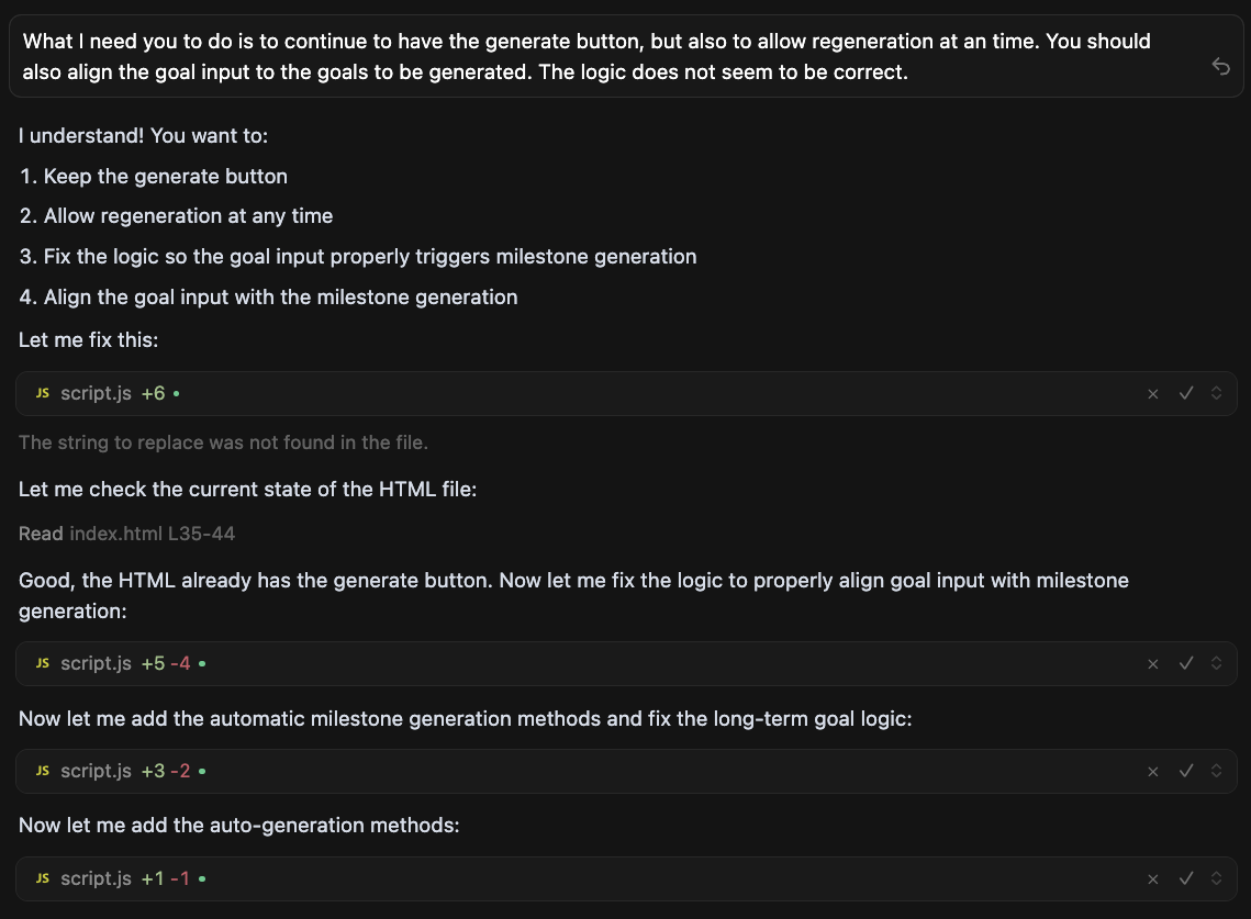 Edit the code. Add new features. Here, I added the ability for the AI to generate steps/milestones to achieve, but it misinterpreted me. It just created default steps and didn’t customize the steps to the actual goal.